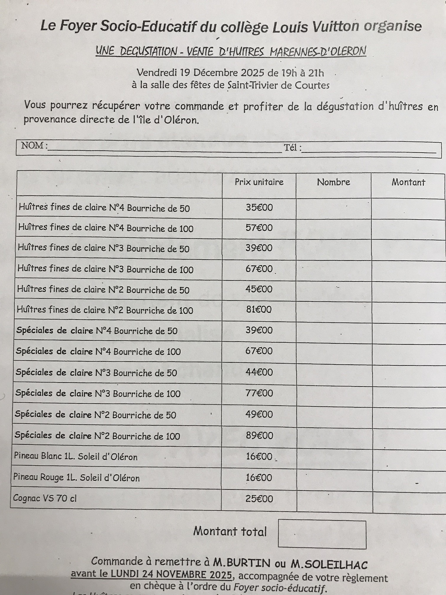 Dès aujourd'hui vous pouvez commander "les huîtres du collège", vos enfants seront destinataires du bon de commande que vous trouverez aussi en PJ. Il vous faut rapporter au collège avant le 24.11 ce bon de commande avec le règlement correspondant.