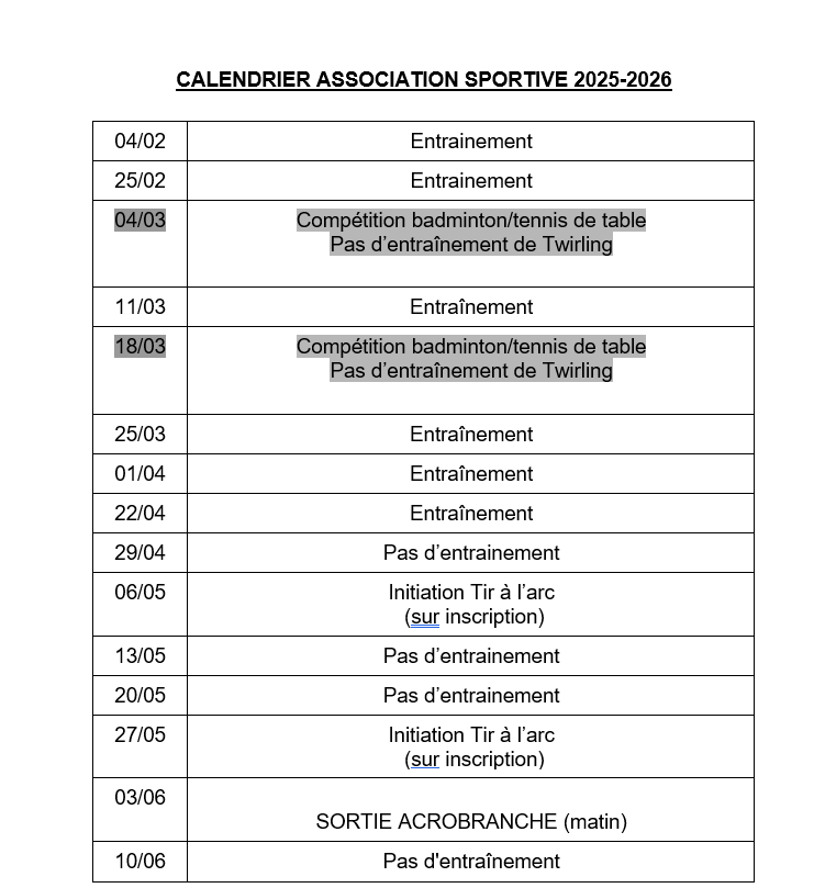 Voici le planning à partir de février et jusqu'à la fin de l'année